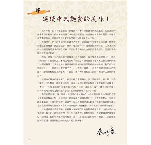 現在終於如願以償,延續《孟老師的中式麵食》,必定要與廣大的讀者們分享《孟老師的麵食小點》;同樣地,還是在兩大類麵食變化下,有主食有點心,有甜有鹹;重點是,本書中的精神,強調舉一反三,觸類旁通的創意,會讓你越做越有趣;當然在用料單純的優勢下,非常符合家庭DIY的便利性,同時也適合接單做生意喔!