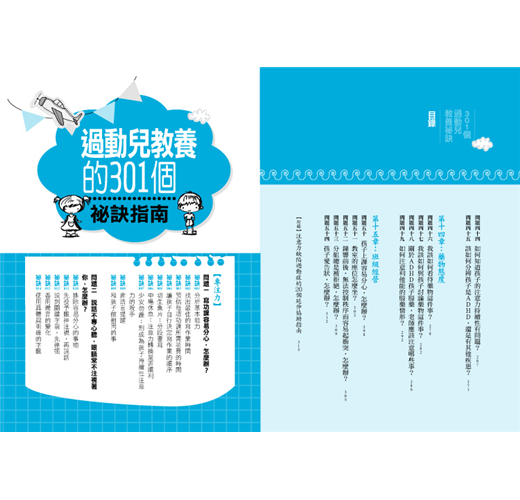 在這本《301個過動兒教養祕訣》中,融合了我自己多年來關於ADHD在早期療育、兒童青少年心理諮商與治療、父母親職教養與校園心理諮詢等臨床實務。書中將和你分享ADHD孩子常面臨的十五項關鍵成長議題。包括:1.專注力2.學習策略3.自我控制4.情緒管理5.社交技巧6.正向思考7.自我概念8.動機態度9.生活管理10.休閒娛樂11.時間管理12.親師溝通13.診斷評估14.藥物態度15.班級經營等內容。同時,提供三○一個問題解決策略,做為ADHD父母在親職管教上,及老師班級經營上的參考祕訣。