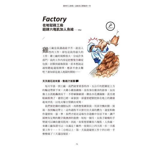 【工廠之膽大心細的屠夫生涯】 牛肉工廠清潔工/血淋淋的牛肉屠宰流程全公開(限制級)/在地獄雞工廠鍛鍊六塊肌加人魚線/海鮮工廠之叫我鮑魚屠夫/洋蔥工廠的投籃神射手養成記/沒錯!澳洲人吃袋鼠肉──搬袋鼠尾巴的日子/打工客小劇場:牛胃爆炸、藍帽的補償心理