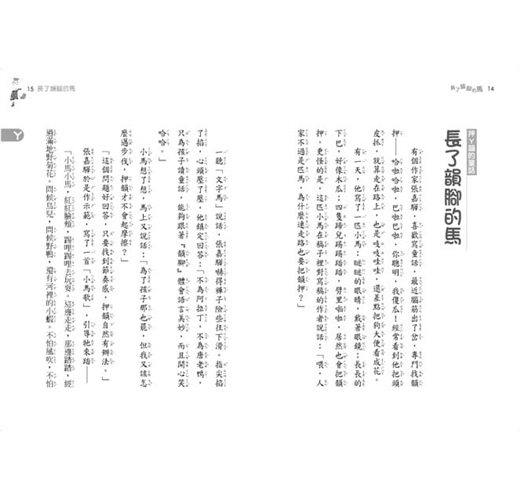 十五年前(一九九九年),我在國語日報社出版了《長了韻腳的馬》。押韻的故事一向有人寫,但是就注音的十五個韻母,有系統的來寫成押韻童話,在此之前並沒有人這麼做。這本書可說是個創舉。