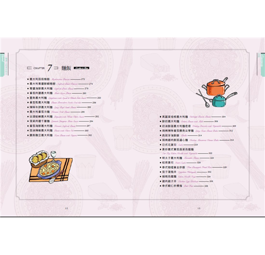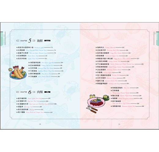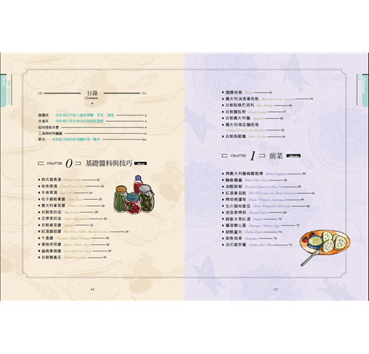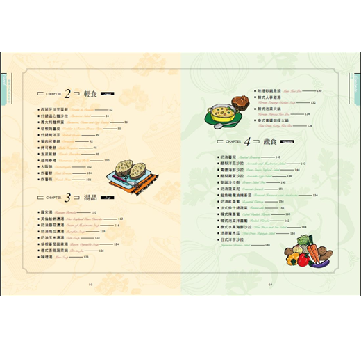 ◆七大主題,110道各國人氣料理全蒐錄,內容豐富完整,從基礎醬料、前菜、輕食、湯品、蔬食、海鮮、肉類與麵飯主食等,應有盡有。