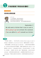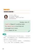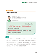 此外,雖然這本書「輕薄短小」,但內容的安排卻有巧思,循序漸進,幫助讀者奠定英文書寫的能力。例如在本書的三個單元中,第一單元先教讀者以便利及常用的單字寫行事曆。其後第二單元介紹寫日記時常用的五十個句型,並詳細解說這些句型的使用方式及時機。最後的第三單元則將第二單元學過的句型和例句串成一篇篇的小日記,並以不同的範本讓讀者仿效。
