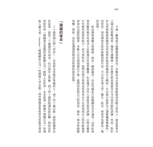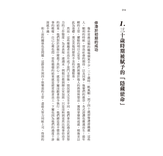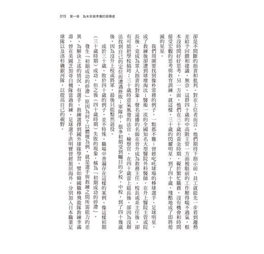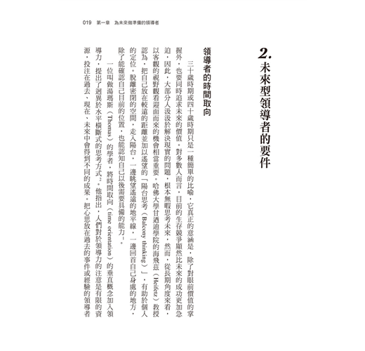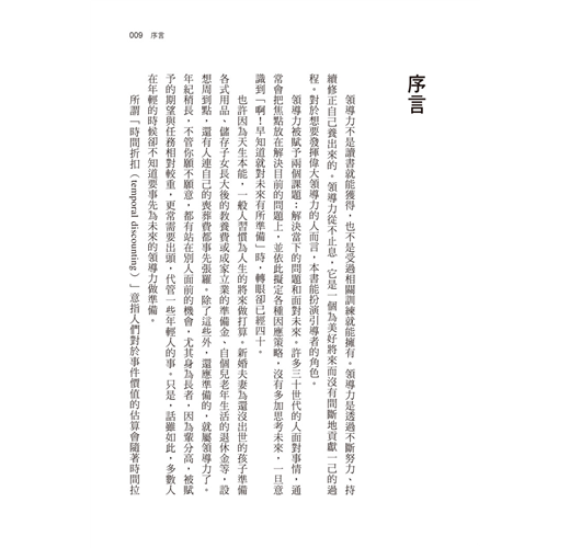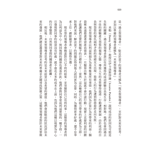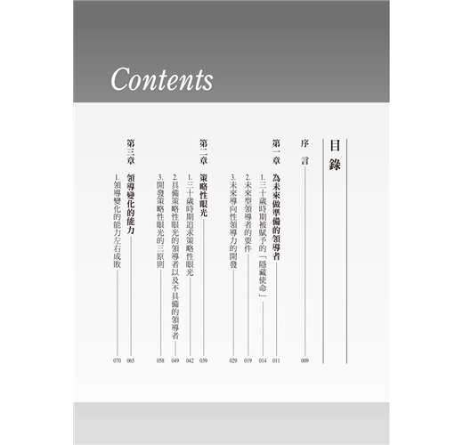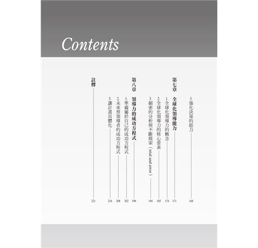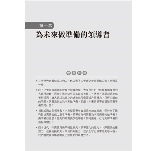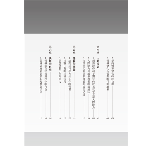 策略性眼光、領導變化、人際能力、任務挑戰、科學性的決斷能力以及全球化領導能力等,指導讀者進行個人領導力的開發。