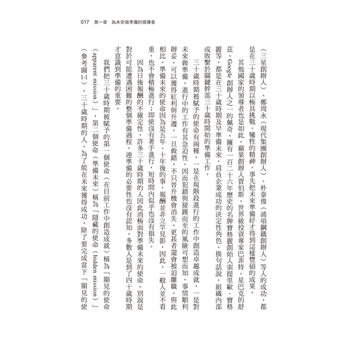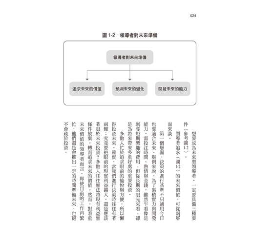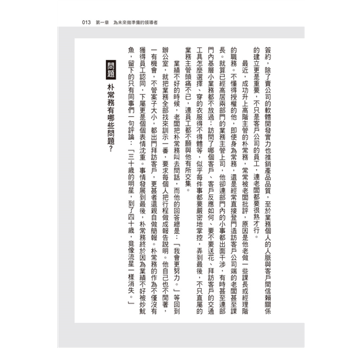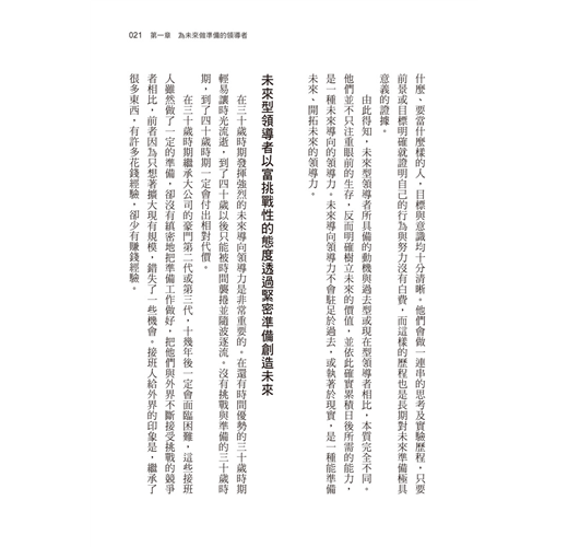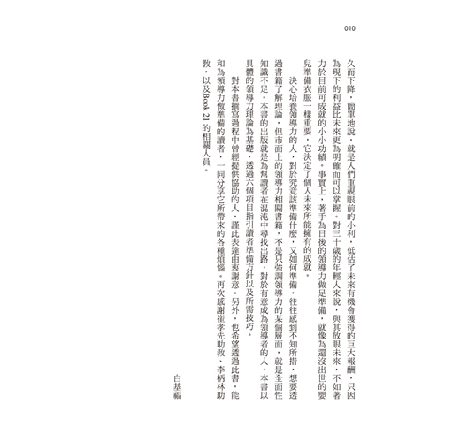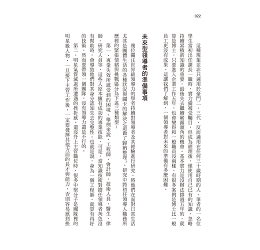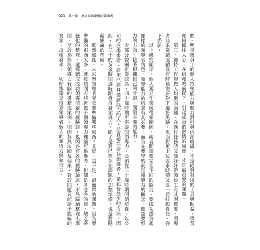 對有意培訓自己成為領導者的人,本書堪稱最實用的隨身講義。作者以具體的領導力理論為基礎,透過六個核心項目:策略性眼光、領導變化、人際能力、任務挑戰、科學性的決斷能力以及全球化領導能力等,逐條說明、解析,指引讀者有關領導力準備的方針及所需的技巧。
