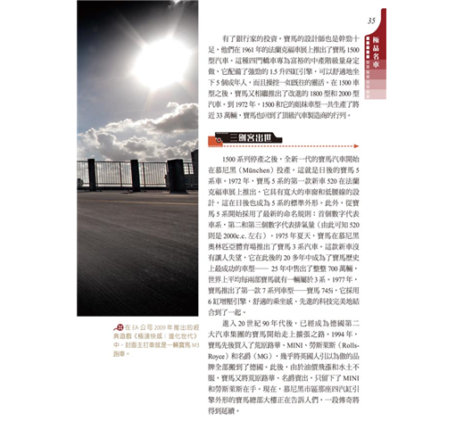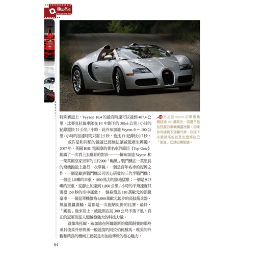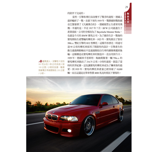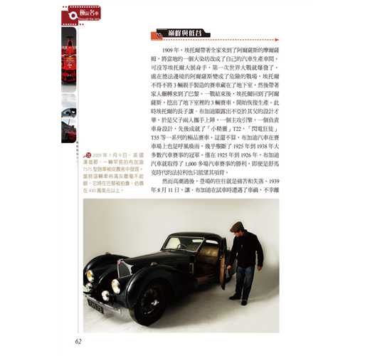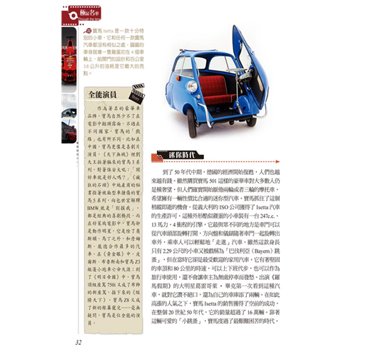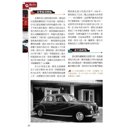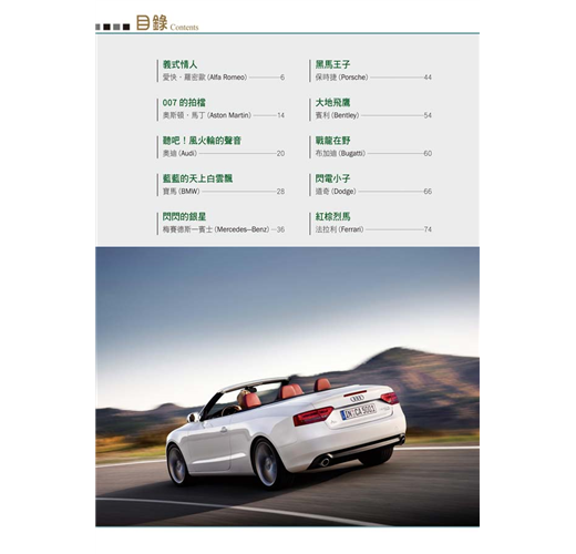 收錄二十六大世界名車品牌故事,不只鑑賞名車配備、性能與外觀,更能深入了解品牌背後設計與創新的理念。完整了解車界相關知識,培養對車的鑑賞能力、收藏最齊全的資訊。搭配內容,以各種大小專欄進行知識補充,或是提供相關的新聞。