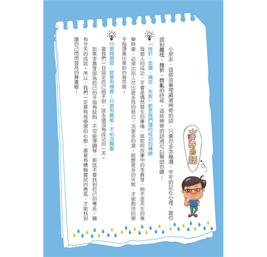 ★由戴晨志老師為小朋友述說十個真人故事,主角從平凡的市井小民到知名的公眾人物,包含戴老師的親身經歷。