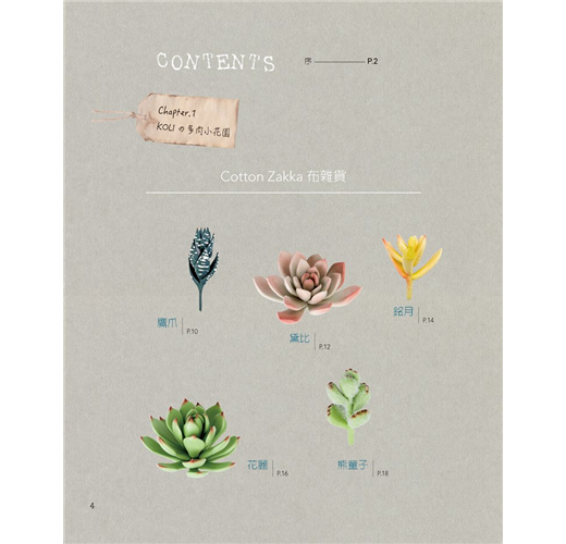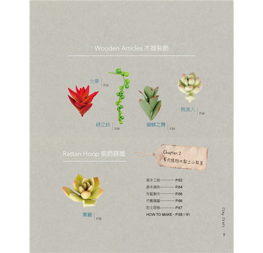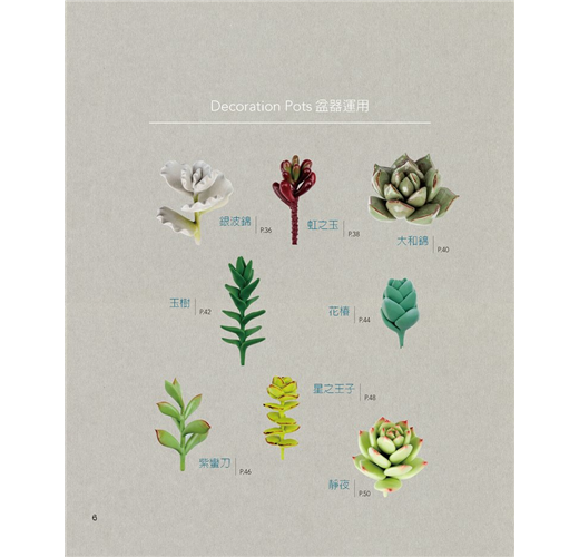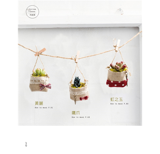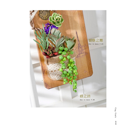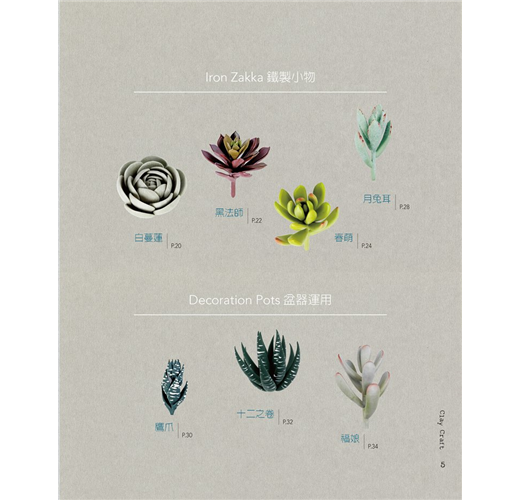 本書收錄25件以多肉植物為主角設計的可愛黏土小物,並貼心地附上自製雜貨容器作法,您可依照植物的特色,作出適合它的盆裁、吊飾、或是美美的藤圈,隨性地在作品中搭配各式多肉植物組合,也是自製多肉植物黏土小物的一大樂趣喲!