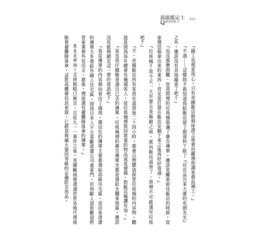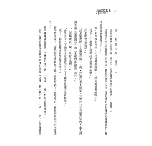 後來我才知道,她在飯田橋開了一家叫做萬能鑑定士Q的鋪子;如招牌所說,不僅鑑定古董、藝術品,連玩具到日用品都無所不接。