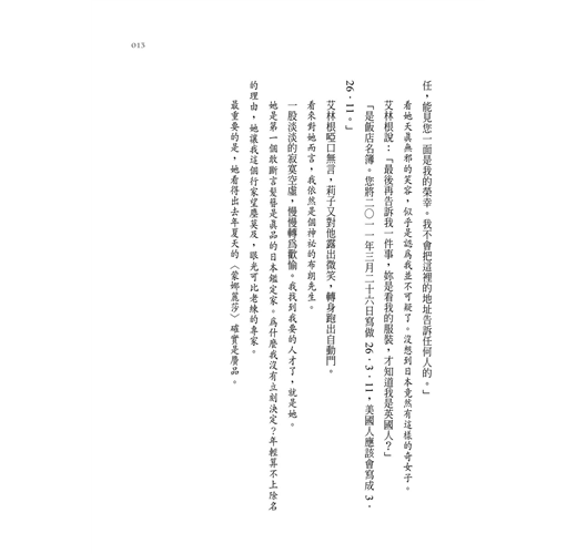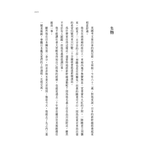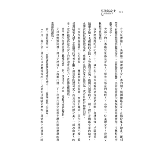大部分的日本鑑定家都是老年人,但也有零星的年輕人,其中有一位美麗女子,最讓艾林根印象深刻。