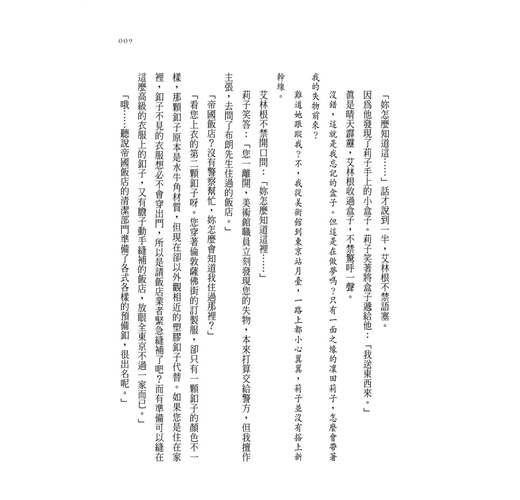 「看您上衣的第二顆釦子呀。您穿著倫敦薩佛街的訂製服,卻只有一顆釦子的顏色不一樣,那顆釦子原本是水牛角材質,但現在卻以外觀相近的塑膠釦子代替。如果您是住在家裡,釦子不見的衣服想必不會穿出門,所以是請飯店業者緊急縫補了吧?而有準備可以縫在這麼高級的衣服上的釦子,又有膽子動手縫補的飯店,放眼全東京不過一家而已。」