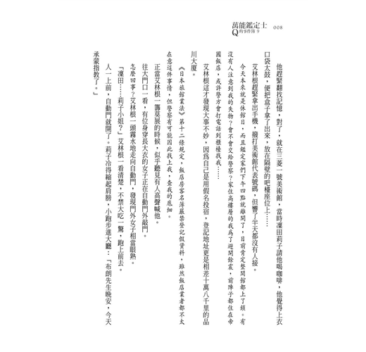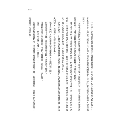 「布朗。」艾林根報上了假名:「美國波士頓人,職業是美術商。妳是……」