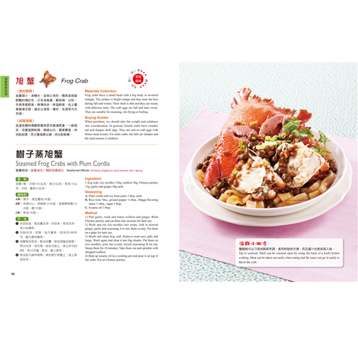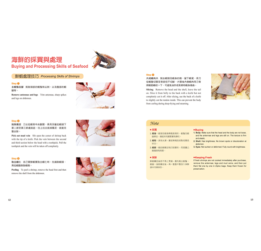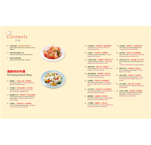 內含59道食譜,依烹調方式分為:海鮮快炒料理、海鮮蒸煮料理和海鮮煎炸料理三大單元,分別採用不同食材示範最佳菜色,色香味令人垂涎三尺。