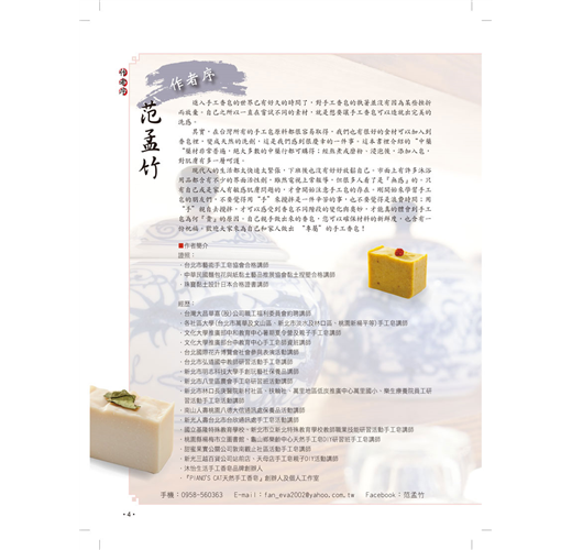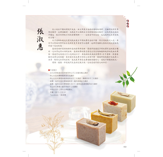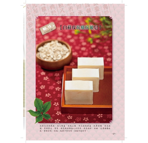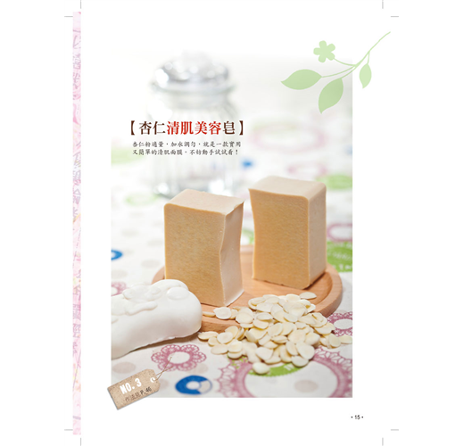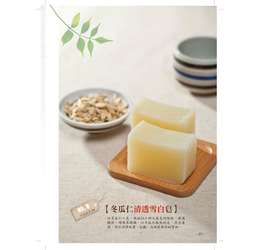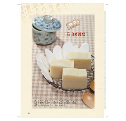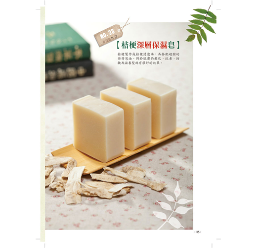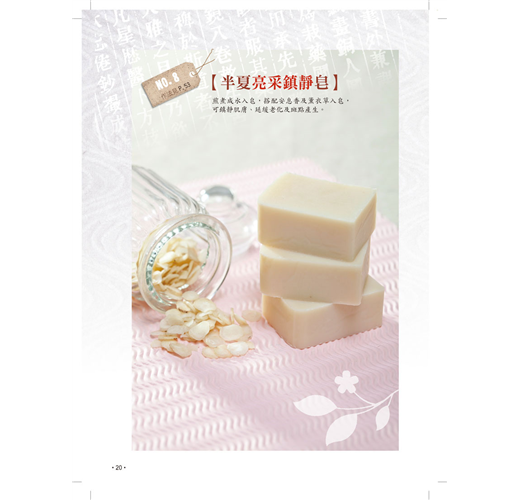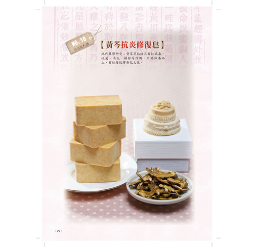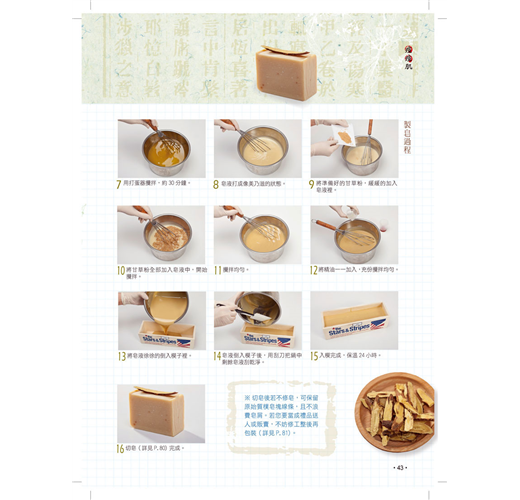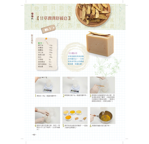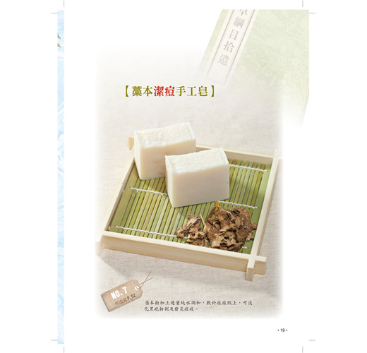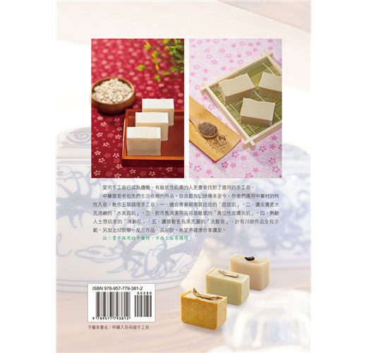 中藥曾是老祖先們生活依賴的用品,自古都有紀錄傳承至今。作者們運用中藥材的特性入皂,教作五類調理手工皂:一、適用青春期常冒痘痘的「痘痘肌」,二、讓皮膚更水亮滑嫩的「水美眉肌」。三、對市售清潔用品容易敏感的「異位性皮膚炎肌」,四、熟齡人士想抗老的「凍齡肌」,五、讓頭髮更烏黑亮麗的「洗髮皂」,計有28款作品全程示範,另加上12款舉一反三作品,共40款,希望將健康分享讀友。