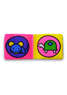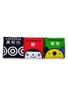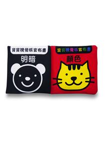 ◎ 幼兒對顏色和形狀的知覺大約在4個月時開始發展,可以分辨對比強、鮮豔顏色的不同,像是黑、白、紅、黃、藍等;3個月前的寶寶較喜歡黑白對比及紅色,而4至8個月大的寶寶則是對紅、黃、橘等顏色較有興趣。所以寶寶視覺遊戲布書針對了顏色的明暗對比及鮮豔,設計出三本布書,讓幼兒能夠隨著年齡及能力的發展不同,對顏色產生認知及刺激。