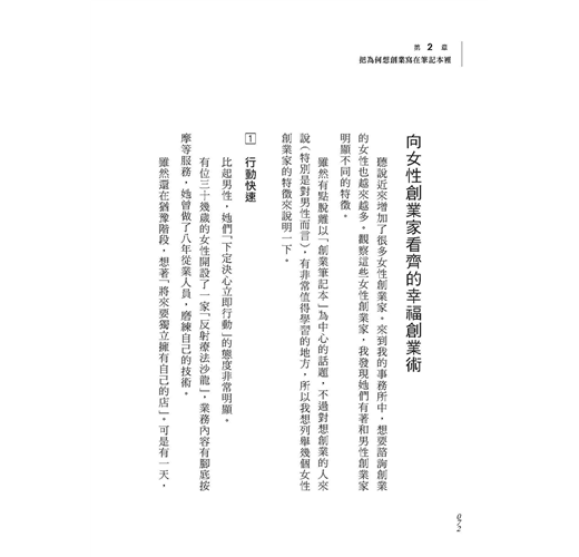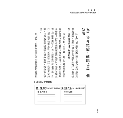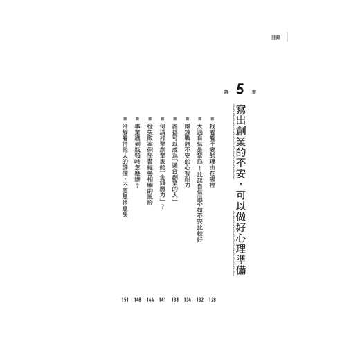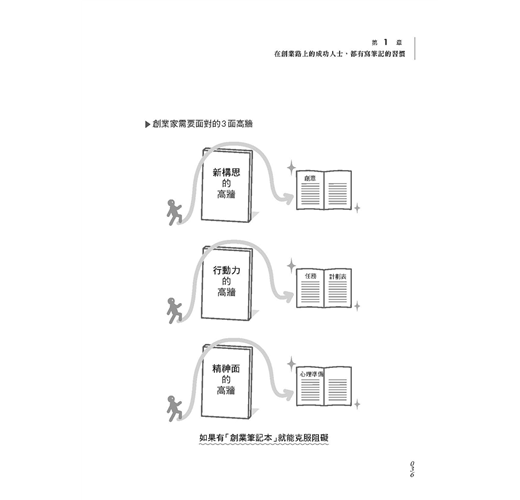 創業是場耐力賽,前方永遠沒有終點站,創業成功的關鍵往往便在於是否有做好充分的準備工作,讓事業有更多的續航力。作者將以筆記本進行準備各項創業工作為主軸,教大家如何有效利用手寫的筆記本,讓準備工作能有確實的進展效益。內容不僅涵蓋成功創業家要具備的資金概念、人脈地圖、知識與技能,更點出自我管理、心理建設、創意、行動力、預想與防範的重要性。本書不像市面上的創業書,只著眼於創業時的要項,更強調創業家應先做好的基本準備工作,學習將眼光放遠、心胸擴大,以創業筆記本隨時檢討自己現行與往後的事業計劃。