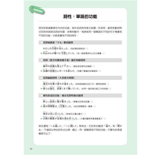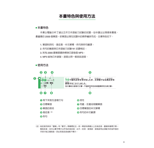 書中每個單語都附有詞性、解釋、例句和例句翻譯,其中例句的難度與日檢N1試題相近,深獲在日外國人好評。繁體中文版另外加註高低音,且同時採數字和畫線兩種標記法,以符合台灣讀者的學習習慣。