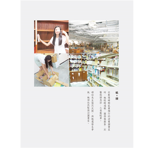 多年來,圖書室因潮濕滲水、通風不良,大部分的百科全書多多少少都會黏在一起。這現象,常讓我在翻頁擦拭時,陷入進度落後的困擾。