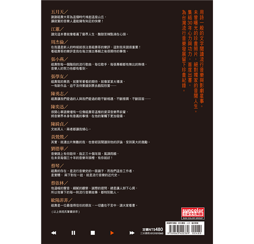 • 隨著流行音樂傳唱,各單元列舉大事紀,讓歌迷、讀者回味的不只是那首歌、也感受歌曲與那個年代背景的氛圍,回想起在那首歌的年代裡,自己經歷了那些人生的歷程?最有質感的娛樂影劇新聞,台灣報業、娛樂圈最具影響力的知名樂評、推手,集結30年心力與功力,首度出書,為華人流行音樂發展留下珍貴紀錄。