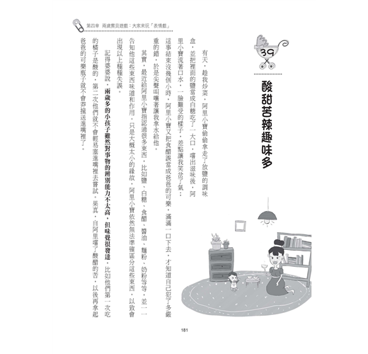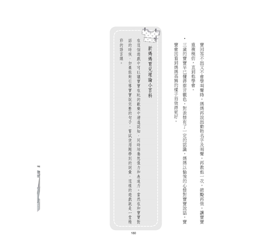 那個叫做快樂的人還可以是情景、是生活,是媽媽的手套、爸爸的公事包,是其他小朋友的秘密、是寶寶自己的小心思︙︙那個叫做快樂的人無處不在,生活中的每一樣東西都可以做為寶寶遊戲的道具,而每一個遊戲又能讓寶寶心中的快樂得到最純粹的釋放,而每位新手爸媽也將擁有最無間的親子關係。