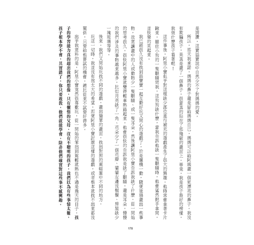 希望讀過此書後,各位新媽新爸都能夠像阿里媽媽一樣與寶寶心中那個叫做快樂的人做朋友,和他一起共同開展親子間最溫暖、溫馨的遊戲,並且,培養出另一個快樂、活潑又鬼馬聰明的「小阿里」。
