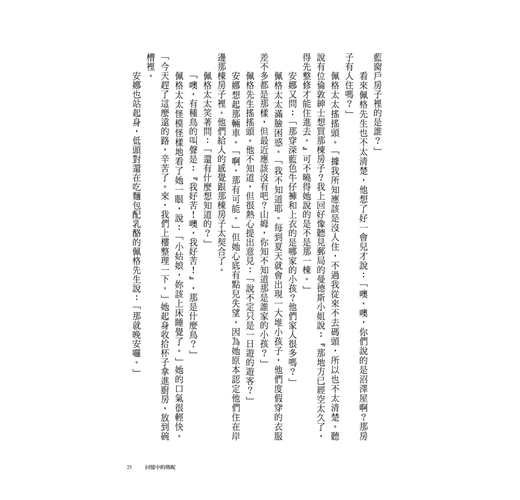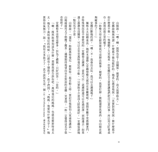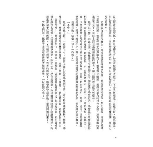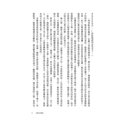 「我叫她阿姨。」安娜想了想,又喃喃地說:「偶爾。」其實她對普瑞斯頓太太通常不用任何稱謂,但她不曉得該怎麼解釋。稱謂是不必要的,因為家裡並沒有很多人,就只有普瑞斯頓先生,他叫他太太「南」。有時候雷蒙也在家,他已經長大成人,目前在銀行工作,他喊他媽媽「咪姆」,有時候也叫「媽」,但那是叫好玩的。安娜覺得喊自己的媽媽「咪姆」很蠢……。可現在她站在佩格先生的椅子前,一臉困惑,不知道接下來該怎麼說明。