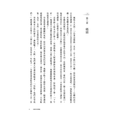 道路的兩側都是田野,是黃色、綠色和棕色的坡地。犁過的田看起來就像是咖啡色的燈心絨布,而包心菜田則是藍色的。公車在田間小路上跑得很快,安娜看見灌木叢裡的鮮紅色罌粟花,左手邊遠處有長長的海岸線。她覺得自己的心跳得好快,快速地環顧四周,別人好像都沒留意窗外,只是忙著說話。他們大概已經習慣這樣的景色,不覺得有什麼稀奇的吧。她直盯著窗外看,漸漸陷入了虛空沉靜的夢境,眼睛卻還睜得大大的。