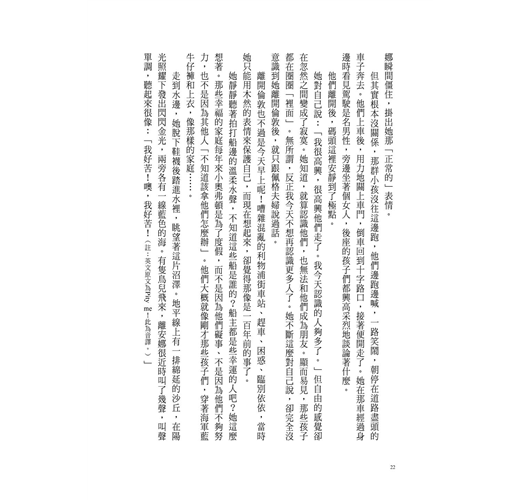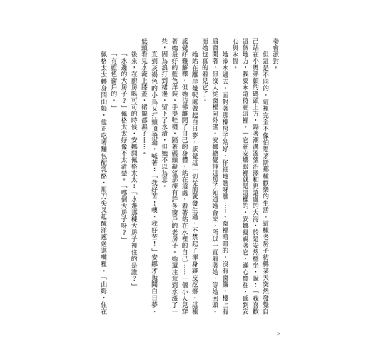看來「正常」表情奏效了,根本沒人注意她。她如釋重負,轉頭望向窗外,窗外是連綿不絕的沼澤地,農舍與農舍之間隔著曠野,每一棟都孤伶伶的。她就只是這麼看著,將腦袋淨空,什麼也不去想。