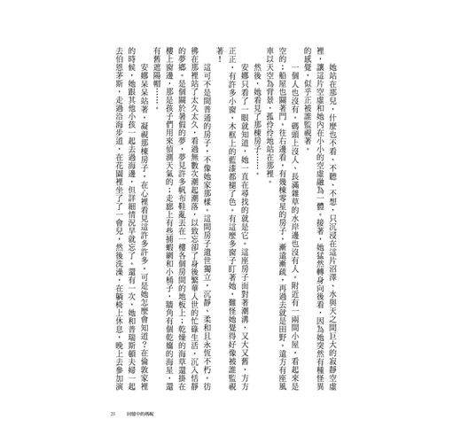 在安娜眼前的是個白牆小房間,天花板低斜,還有扇小矮窗,矮到她得彎腰才能看見外面。窗外是個小院子,有間外屋,牆上掛著錫製的長澡盆。那邊再過去就是田野了。