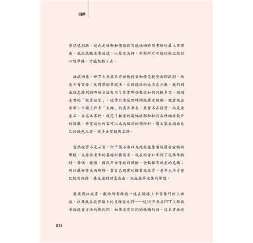 1982年生,畢業於台大政治系,現為電子業專案經理。投資經歷15年,大學時期踏入股市,學生時代熱衷於嘗試各種投資方法,資產也大起大落;進入職場後,為了克服爆肝工作、研究時間不足的困境,自己歸納出一套「低檔價值選股、高檔順勢操作」的懶人投資法,並長期在網路上分享心得,每年篩選出一些體質好、股價便宜的包租股,供網友事後驗證,績效大幅超越同期間的大盤。
