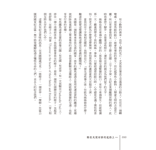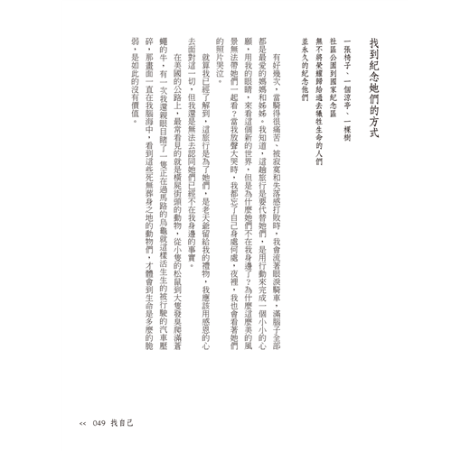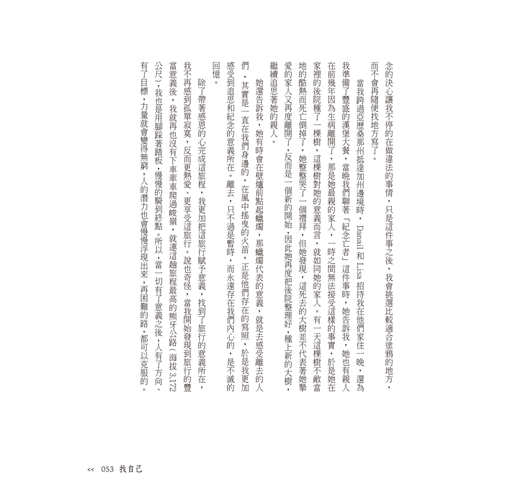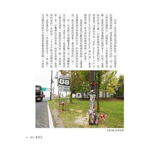 我開始以這段旅程紀念著我的母親和姊姊,每走過一段路,我都會在路旁留下紀念她們的標語,我找到了出發的理由,也找到了繼續完成旅行的動力,我不再感到疲累,也不再感到寂寞。