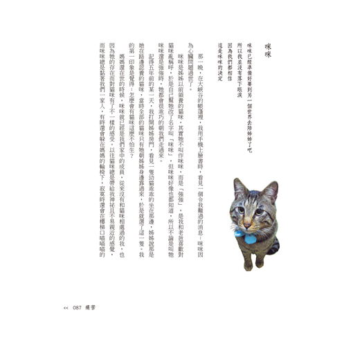 2011年,家中遭逢巨變,是人生中最黑暗的時期,小腦萎縮的母親在家中過世,隔年姊姊在上班路上因為車禍也相繼過世,短短的兩年之內去了最照顧我及最愛護我的母親和姊姊,面臨了人生最大的挫折和失落感,於是決心放下手中的一切出發,來一趟認識自我的單車旅行。著作《騎在天使安排的道路上》(太雅出版社)。