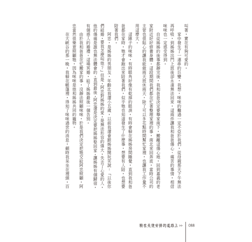 「你是為了什麼去旅行?」剛出發時在紐約的迷惘、慌張,抵達芝加哥後的勇敢、堅定,乃至於行經Des Moines意外入住Laura的家,永威終於明白,這一趟旅程,是化為天使的母親與姊姊,最後賜予的禮物。
