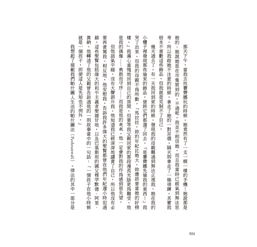 幾天過去了。有一天我回到家的時候,發現我的母親難過到無法正視我。她在我的小櫃子裡發現那些偷來的飾品,便將它們都還了回去。「是賽費娜先偷我的東西!」我哭了出來。但我的母親不為所動。「馬拉拉,妳的年紀比她大。妳應該要當她的好榜樣。」我滿心羞愧地回到自己的房間。但要等我父親回家的那段漫長光陰更為難受。他是我的偶像──勇敢而守序──而我是他的親親。他一定會對我的作為感到很失望。