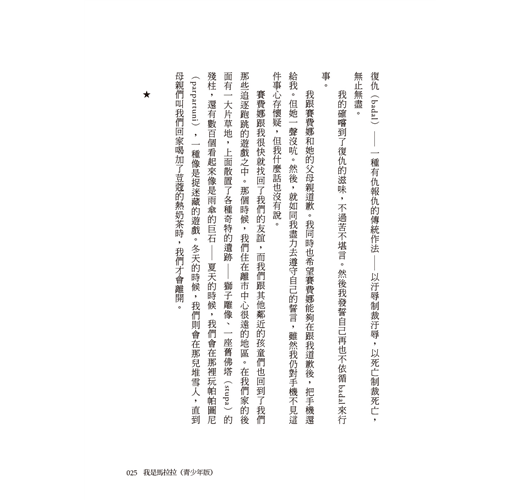 我的父親沒理會這些習俗。我在族譜中看見了自己的名字──用亮藍色的墨水寫的──被寫在那些男性名字之間。我的名字是三百年來第一次被記錄進族譜中的女子名。