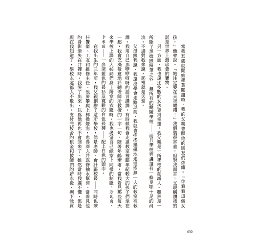 另一方面,我也遠比多數的女孩更為幸運:我父親是一所學校的創辦人。雖然是一所除了黑板跟粉筆之外一無所有的簡陋學校──而且學校旁邊還有一條臭味十足的河流。不過對我來說,那裡就是天堂。