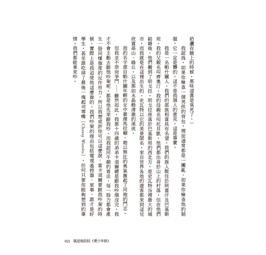 也許是因為從那些墜地的風箏上,我也看到了自己的未來──就只因為我是個女孩。無論我父親怎麼說,我知道當賽費娜跟我年紀大一些以後,我們就會被要求為自己的兄弟下廚、打掃。我們可以選擇當醫生,因為女性患者會需要女醫師看診。但我們沒辦法成為律師或工程師、時裝設計師或藝術家──或任何我們夢寐以求的職業。我們也不能隨便離開自己的家,除非有一名男性的親屬陪同我們出門。