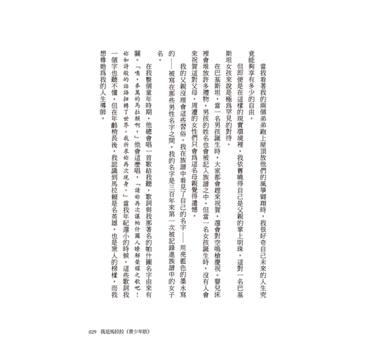 在我整個童年時期,他總會唱一首歌給我聽,歌詞與我那著名的帕什圖名字由來有關。「噢,麥萬的馬拉賴啊,」他會這麼唱,「請妳再次讓帕什圖人瞭解榮耀之歌吧!妳如詩般的話語扭轉了世界。我祈求妳再次現身。」當我年紀還小的時候,這些歌詞我一個字也聽不懂。但在年齡稍長後,我認識到馬拉賴是名英雄,也是眾人的榜樣,而我想尊她為我的人生導師。