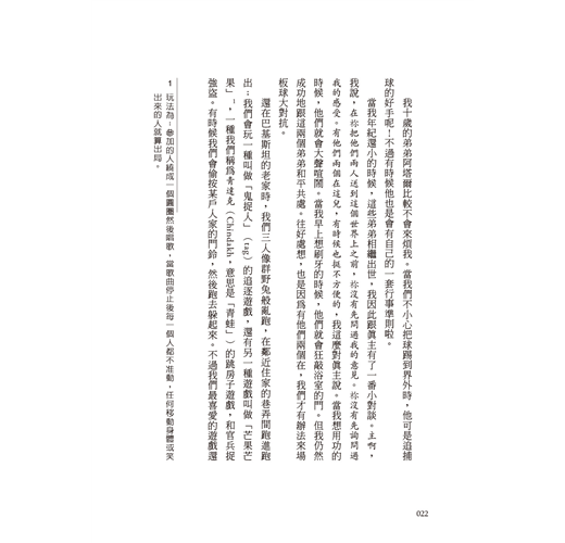 還在巴基斯坦的老家時,我們三人像群野兔般亂跑,在鄰近住家的巷弄間跑進跑出;我們會玩一種叫做「鬼捉人」(tag)的追逐遊戲,還有另一種遊戲叫做「芒果芒果」,一種我們稱為青達克(Chindakh,意思是「青蛙」)的跳房子遊戲,和官兵捉強盜。有時候我們會偷按某戶人家的門鈴,然後跑去躲起來。不過我們最喜愛的遊戲還是板球。不分日夜,我們都會在自家屋旁的巷弄或平坦的屋頂上打球。我們買不起球的時候,我們就會用一只塞滿廢物的舊襪子來代替;而球門則是用粉筆畫在牆上。阿塔爾是我們之中年紀最小的,因此如果球從屋頂滾落時,他就會被派去把球找回來;有時在尋找的過程中,他會拿走鄰居家的球。回來時,他臉上會掛著一彎奸笑並聳聳肩。「怎麼啦?」他會這麼說。「他們昨天還不是拿走了我們的球!」