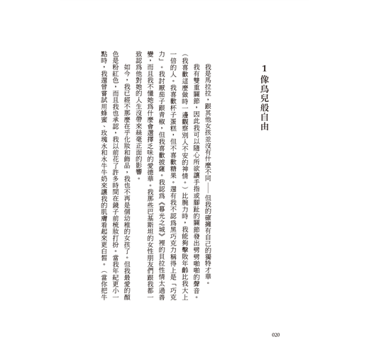 被迫遮掩身體的生活看起來是如此的不公平──而且也不舒服。在我年紀還小的時候,我告訴父母,不管其他女孩如何應對,我絕對不會像她們一樣遮蔽自己的臉龐。我的臉就是我的身分。我那相當虔誠且傳統的母親對我的言論大感震驚。我們家的親戚認為我十分勇敢。(有些人則是認為我無禮。)但我的父親說,我可以隨心做自己。「馬拉拉會過得像鳥兒般自由自在。」他對每一個人都這麼說。