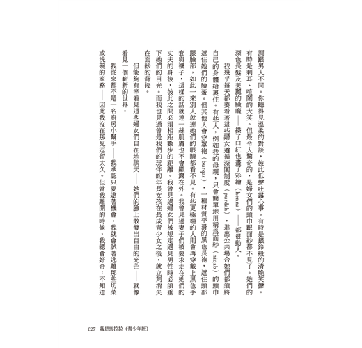 我幾乎每天都要看著這些婦女遵循深閨制度(purdah),進出公共場合她們都須將自己的身體給裹住。有些人,例如我的母親,只會簡單地用稱為面紗(niqab)的頭巾遮住她們的臉蛋。但其他人會穿罩袍(burqas),一種材質平滑的黑色長袍,遮住頭部跟臉部,如此一來別人就連她們的眼睛都看不見。有些更極端的人則會再穿戴上黑色手套與襪子,這樣的話就連一絲肌膚也不會顯露在外。我曾見過妻子們被要求走在她們的丈夫的身後,彼此之間必須相距數步的距離。我曾見過婦女們被規定遇見男性時必須垂下她們的目光。而我也見過曾是我們的玩伴的年長女孩在長成青少女之後,就立刻消失在面紗的背後。