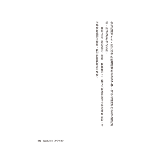 父母跟我說,我還沒學會走路以前,我就會搖搖擺擺地走進空無一人的教室裡教課。我用自己那咿咿呀呀的語言講課。有時候我會走進教室裡跟年紀較大的孩子們坐在一起,我會充滿敬意地聆聽老師所教授的一字一句。隨著年齡漸增,當我看見那些每天來學校上課的大姊姊們身上所穿的衣服時,我也渴望自己能穿上同樣的制服:沙瓦爾.卡米茲──一套深藍色的長衫及寬鬆的白色長褲──配上白色的頭巾。