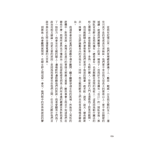 我通常會從孩童們的遊戲中漫步離開,躡手躡腳穿過女性的區域,然後加入男性的群體中。對我來說,那裡正在進行的事情又刺激又重要。雖然事實上我並不知道他們在聊些什麼,我理所當然也不懂政治,但我卻能感受到男人們所身處的嚴肅世界對我產生了一股拉力。我會坐在父親的腿上,邊喝飲料邊聆聽他們的對談。我喜愛聽男士們為了政治而相互辯論。但更主要的原因,是因為我喜愛坐在他們之間,任自己沉醉於他們言談中那比史瓦特谷還要寬廣的大世界。