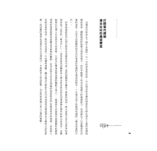 承襲自科比意、路易斯康等以來現代建築各大門派的論述、基本心法及武功招式,進入前所未有的新戰國時代,打開了當代建築潘朵拉似的魔宮寶盒。