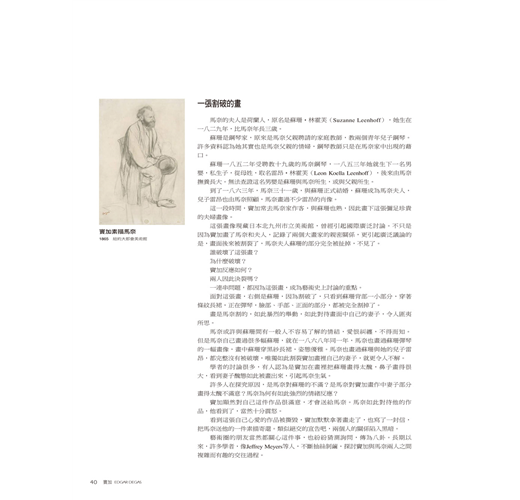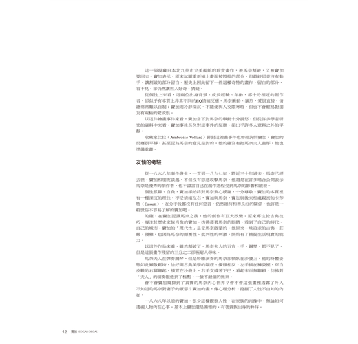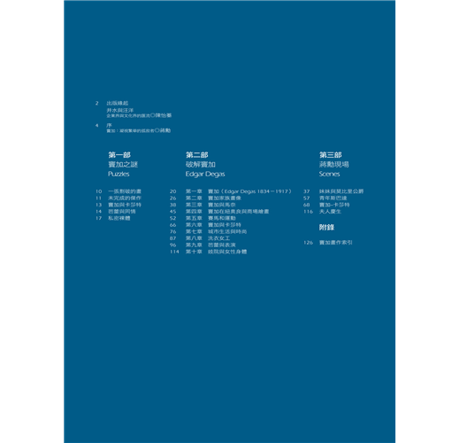 竇加,對一般大眾而言,最熟悉的就是他芭蕾舞主題的系列。但是竇加創作的面向十分寬廣,他的作品涵蓋好幾個不同主題,這本書從他最早的自畫像和家族肖像談起,探索竇加的貴族出身,以及他扎實嚴格的古典人文背景。