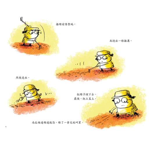 神祕的種子漸漸長大,開了一朵大黃花,慢慢結出一個瓜,它究竟是什麼瓜?南瓜妹在菜園裡,還會發現什麼令人驚喜的變化?