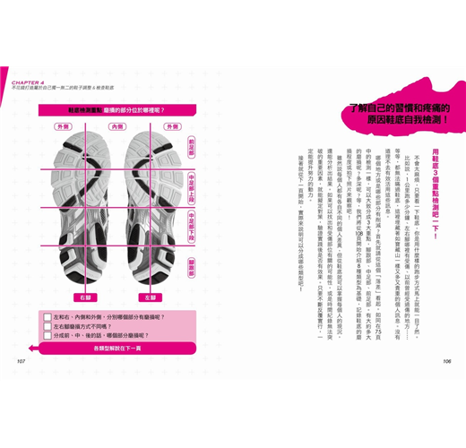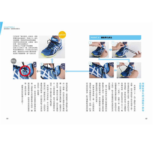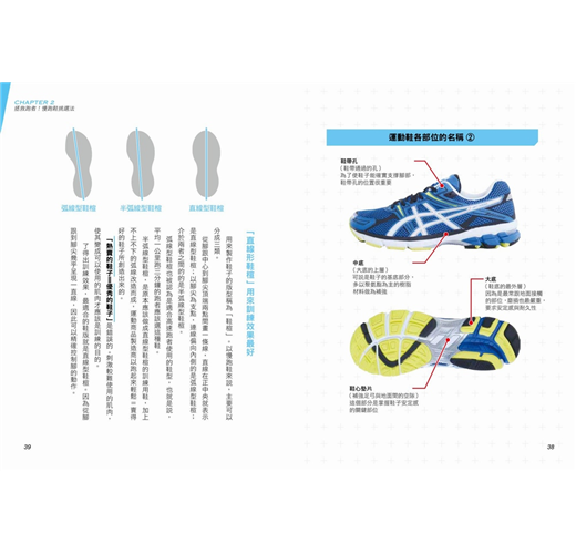 從跑鞋構造、鞋帶、鞋墊,到正確穿鞋方法,皆以圖片清楚分析。