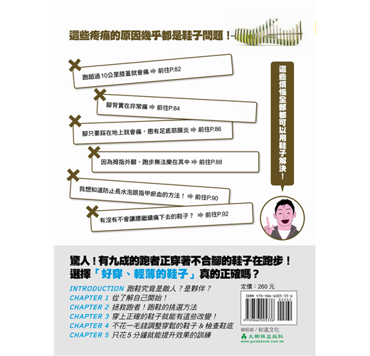本書清楚點出一般人最常有的錯誤選鞋常識,並且比較歐美與亞洲人的體型特徵。翻開本書,也許你會發現,原來至今認為正確的鞋子知識都是錯誤的。而這些正確的觀念,可能是一般人,甚至連運動用品店店員或是頂尖跑者都不懂的正確選鞋觀念。