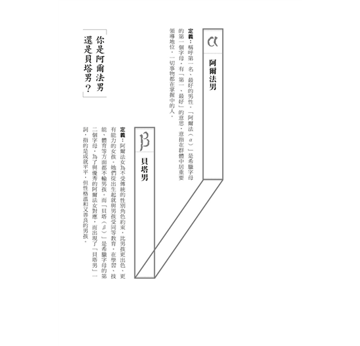 實際上,按照性格區分的「阿爾法男」或「貝塔男」,並不是區分優越或劣等的概念。任何人只要充分理解自己,擁有掌控自己的人生的能力,那麼他就是阿爾法男。因此,性格像貝塔男但能在某種程度上獲得成功的人生,以及正在像這樣生活的人,我把他們也歸類於阿爾法男。