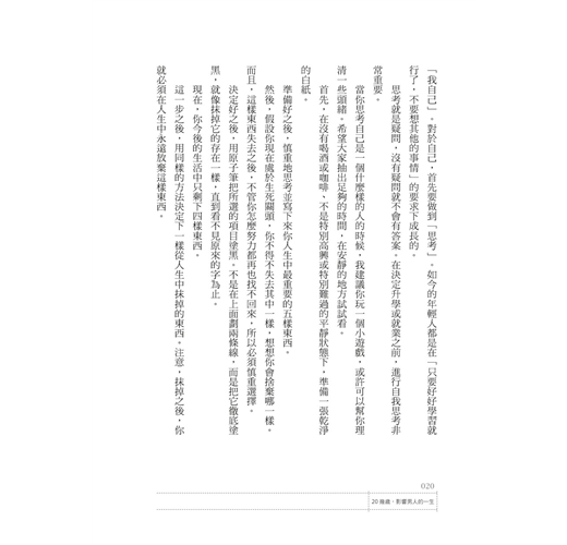 已經在成長的過程中形成較高的內省智能的人,即便不刻意提醒自己,他的生活本身就是書寫這本書的過程。但是,並不是所有人都如此幸運。二十幾歲是開始依靠自我的力量爭取自己無法選擇的東西的時期。所以,二十幾歲的人最應該爭取的,正是了解自己的能力。