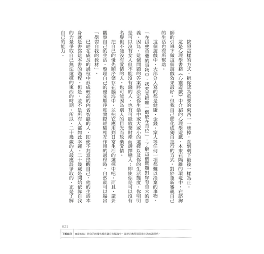「在這些重要的事物中,我究竟把哪一個放在首位﹂,了解這個問題對你有重大的意義。因為,這個問題的答案將決定你生活中或大或小的選擇以及你的生活態度。你明明是可以沒有女人但不能沒有錢的人,也有可能放棄財產而選擇戀人;即使你是可以沒有名譽但不能沒有愛情的人,也可能因為別人的目光而放棄愛情。